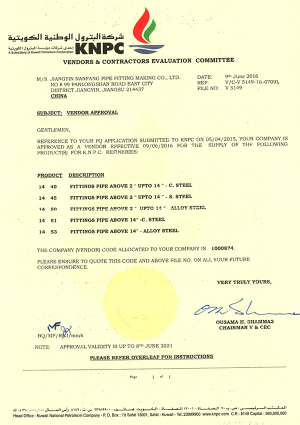 تحصلنا على العديد من الشهادات تشمل شهادة TUV ISO 9001، وشهادة TUV CE-PED، وشهادة API ISO 9001، وشهادة API Q1، شهادة NORSOK M650، شهادة WSF ISO 9001، شهادة WSF ISO 14001، شهادة WSF OHSAS 18001.